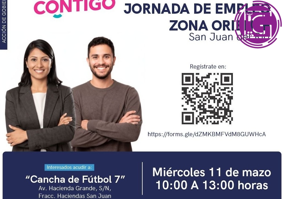 La Secretaría del Trabajo (ST) invita a los habitantes de San Juan del Río a participar en la Jornada de Empleo zona oriente, que se realizará el 11 de marzo, de 10:00 a 13:00 horas, en la Cancha de Futbol 7 del fraccionamiento Haciendas San Juan, donde 12 empresas e instituciones estarán ofertando más de 350 vacantes de los sectores industrial, comercio y servicios, dirigidas a perfiles con escolaridad desde primaria hasta licenciatura, y sueldos que pueden alcanzar los 20 mil pesos mensuales.