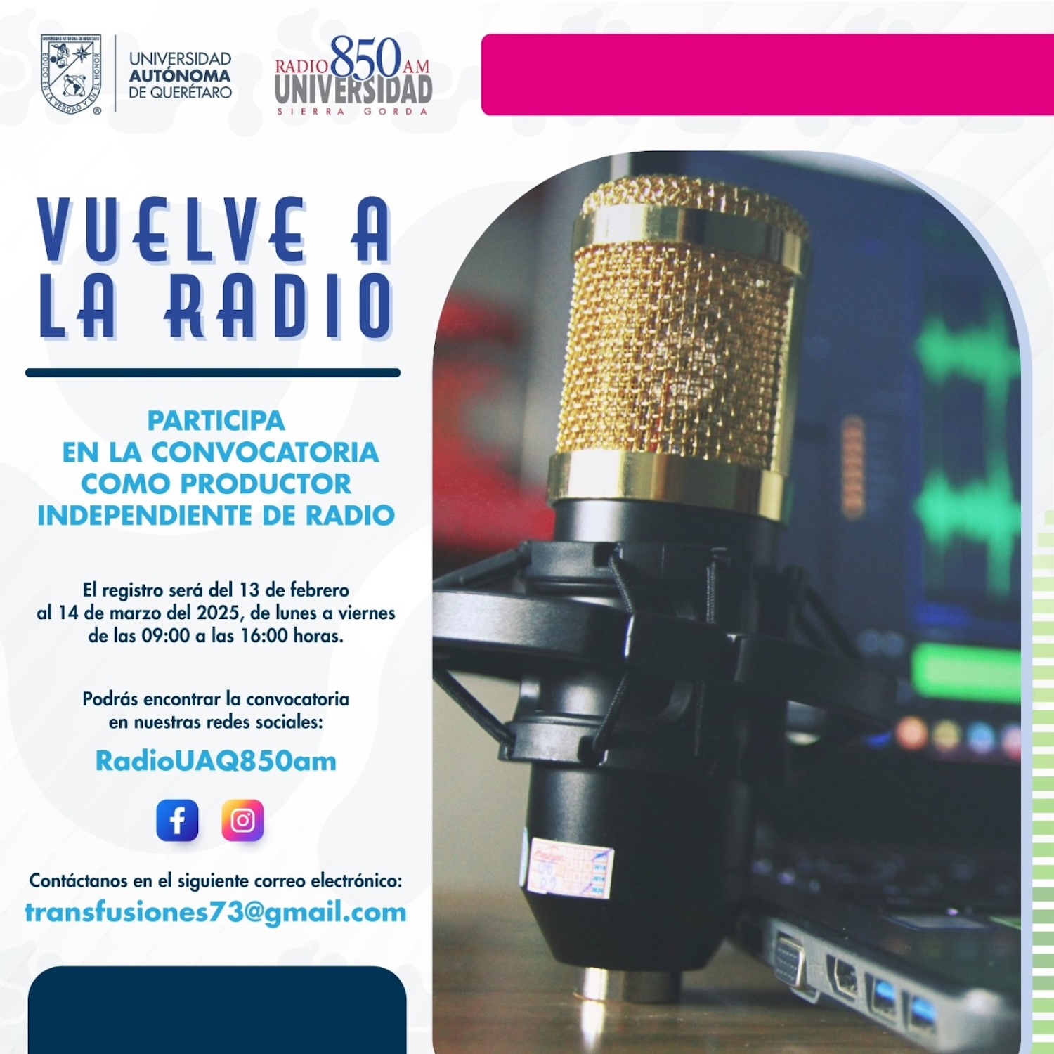 La Universidad Autónoma de Querétaro (UAQ) –a través de Radio UAQ– invita a inscribirse en la convocatoria “Vuelve a la radio”, cuyo objetivo es involucrar a las nuevas generaciones en la producción de materiales sonoros que destaquen la importancia de este como un aliado en comunicación y que permite llegar a zonas de difícil acceso. Los interesados tendrán la posibilidad de difundir sus producciones en las emisiones de Radio Universidad 850 AM.