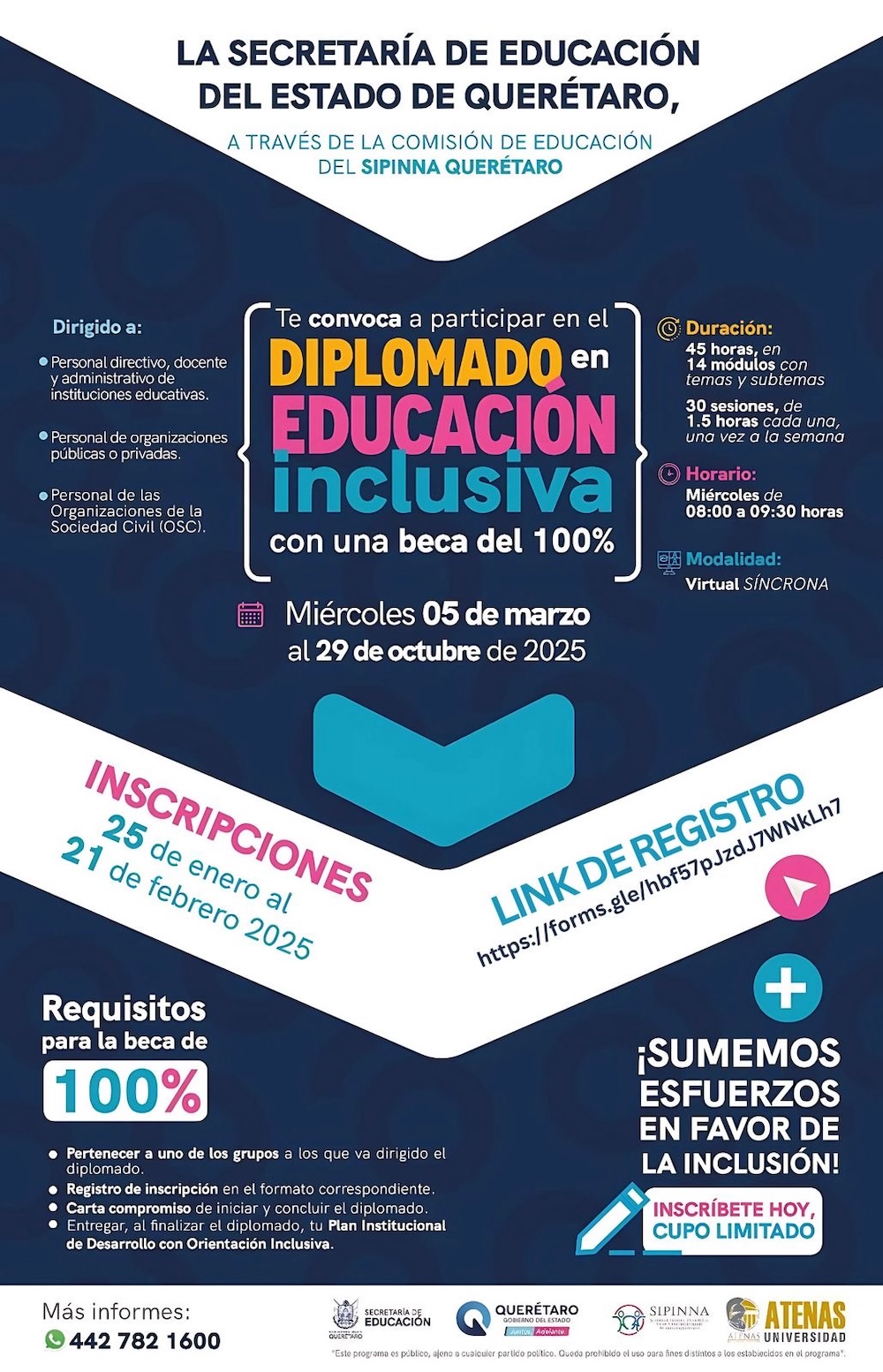 El diplomado se llevará a cabo con apoyo de la Universidad Atenas de forma virtual, a través de la plataforma zoom, consta de 14 módulos y 30 sesiones de una hora y media de duración. La funcionaria de la Sedeq subrayó que se cuenta con una beca del 100 por ciento para quienes pertenezcan a uno de los grupos a los que va dirigido el curso y realicen su registro correspondiente.
