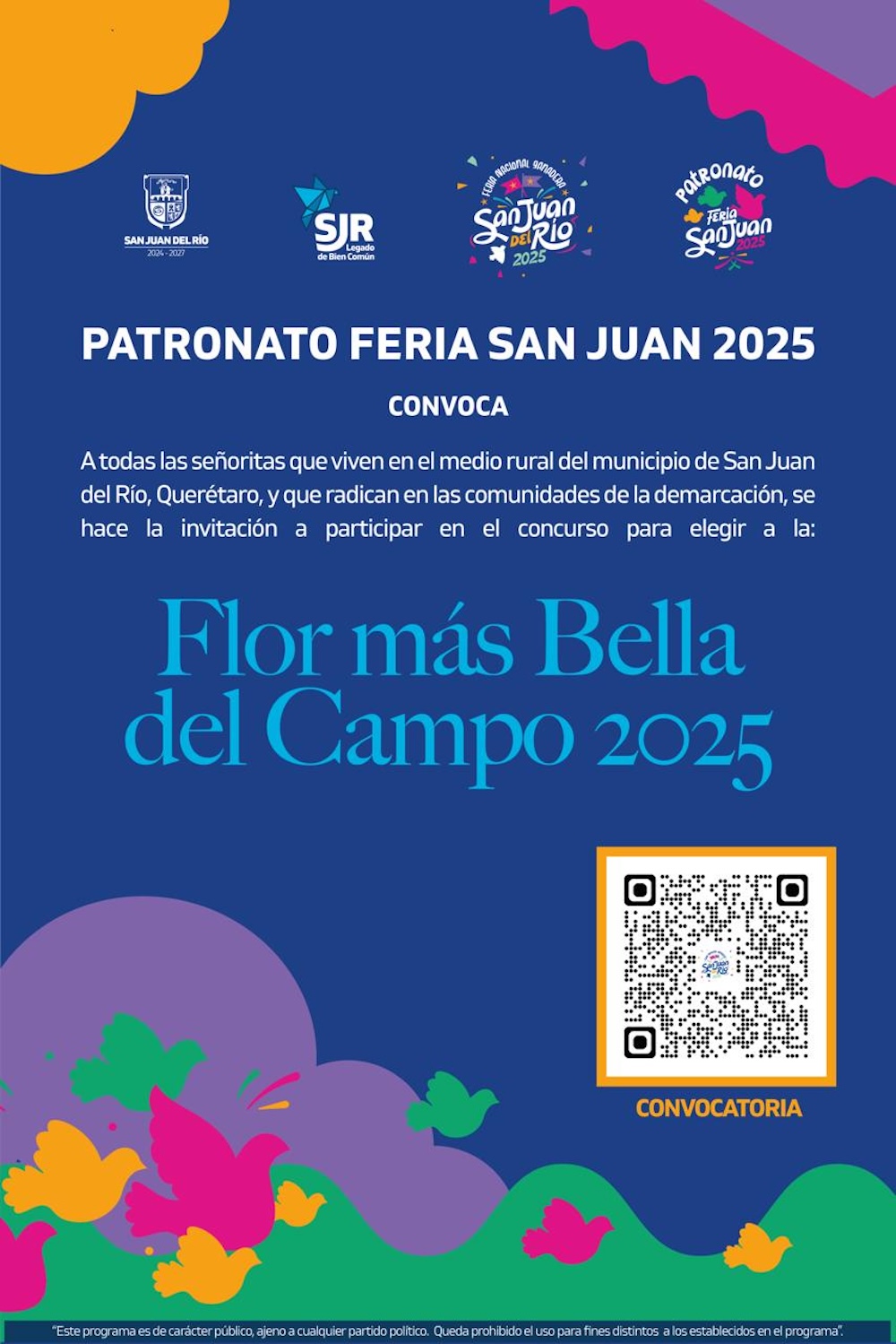 El Patronato de la Feria Nacional Ganadera San Juan del Río 2025 emitió la convocatoria para participar en el concurso de la “Flor Más Bella del Campo”, a través del cual, además de elegir a la ganadora del certamen, se premiará al mejor carro alegórico. El concurso se llevará a cabo el domingo 15 de junio a partir de las 10:00 horas en la Plaza Independencia, ubicada en el Centro Histórico de la demarcación.