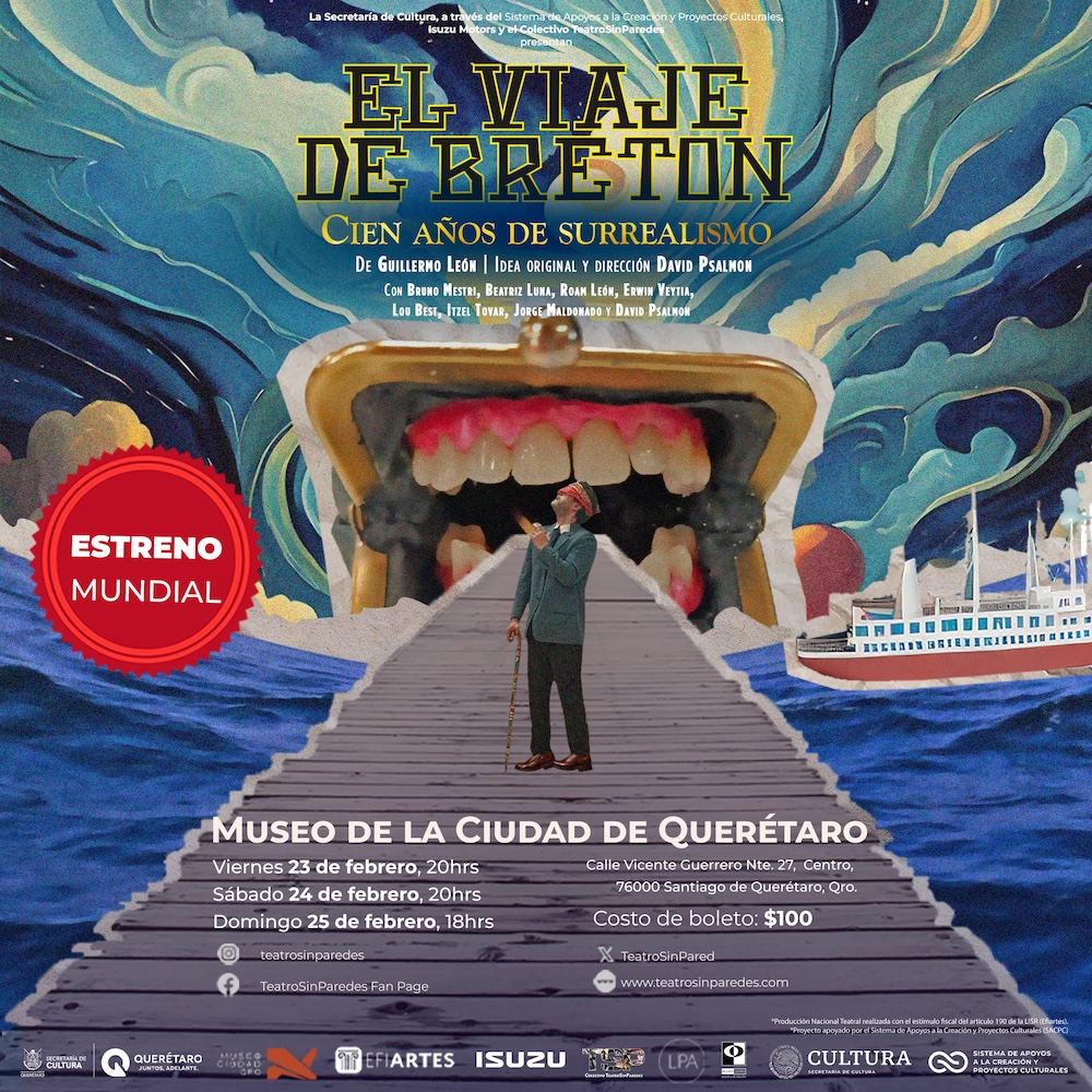 El viernes 23 de febrero el Museo de la Ciudad de Querétaro, de la Secretaría de Cultura del estado, será sede del estreno mundial de la obra “El Viaje de Breton, cien años de surrealismo”, una creación multidisciplinaria del colectivo TeatroSinParedes en la que se cruzan el teatro, la música interpretada en vivo y las artes visuales para generar una experiencia sensorial e intelectual múltiple.