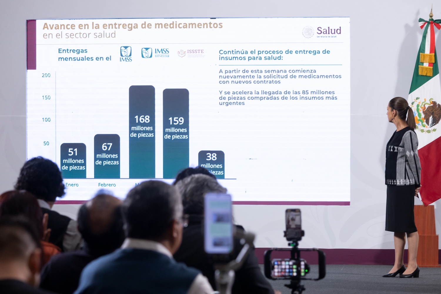 La presidenta de México destacó que el nuevo modelo de Contratación Consolidada de Medicamentos e Insumos Médicos es transparente y permite que los medicamentos lleguen a los centros de salud y hospitales de todo el país, en contraste con los gobiernos neoliberales, donde se implementó un esquema de monopolización con compras a sobreprecio.