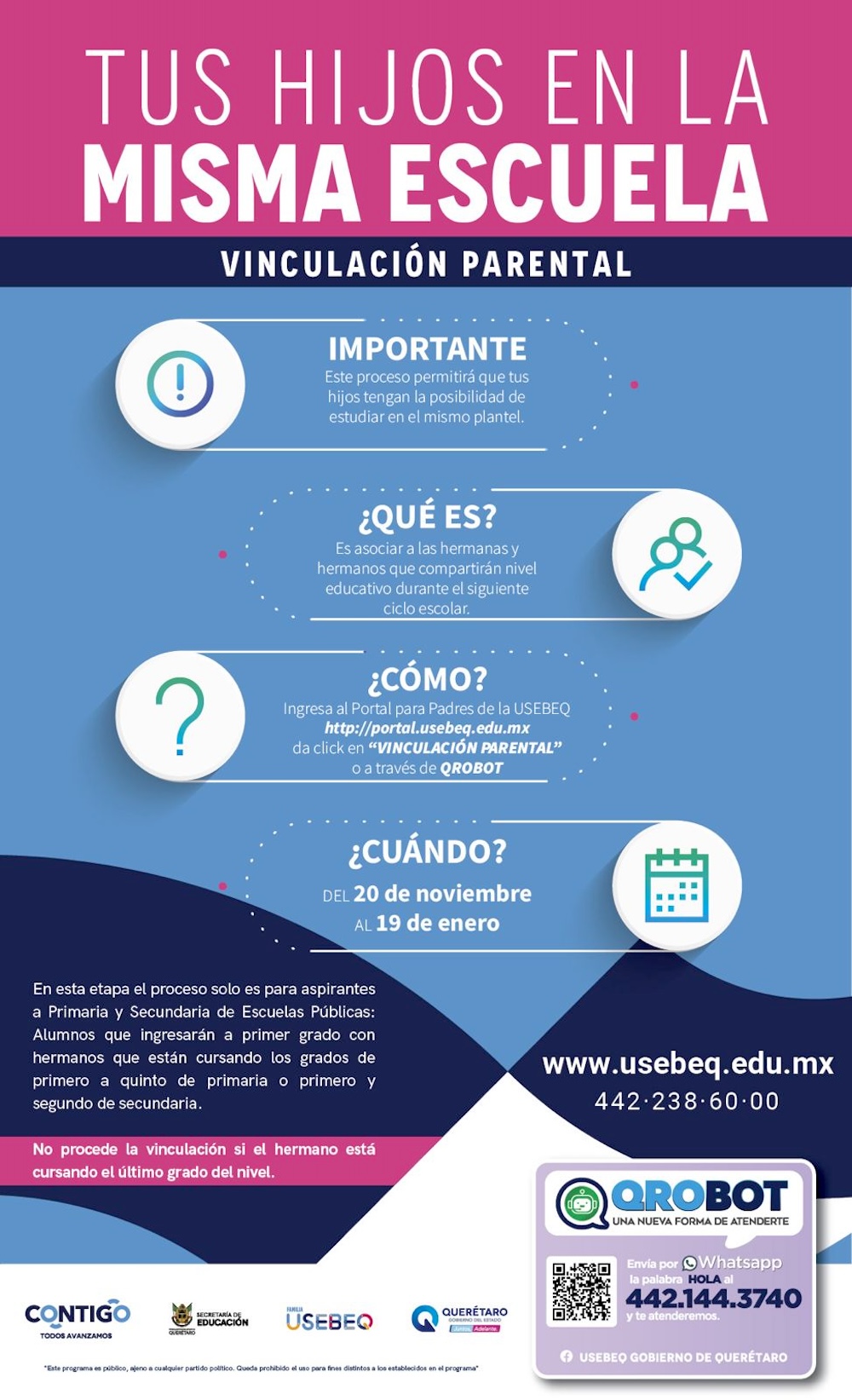 Personal de la Unidad de Servicios para la Educación Básica en el Estado de Querétaro (USEBEQ), recuerda a padres de familia o tutores que tienen hasta el viernes 19 de enero para llevar a cabo en el Portal para Padres de Familia de la página de la USEBEQ la vinculación de hermanos en educación básica.