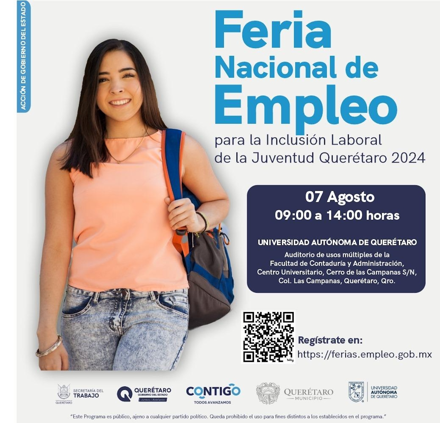 La Secretaría del Trabajo (ST) alista la Feria Nacional de Empleo para la Inclusión Laboral de la Juventud Querétaro, espacio que permitirá acercar poco más de mil vacantes a los jóvenes de la capital queretana, el próximo 7 de agosto en el auditorio de usos múltiples de la Facultad de Contaduría y Administración de la Universidad Autónoma de Querétaro (UAQ), en un horario de 9:00 a 14:00 horas.