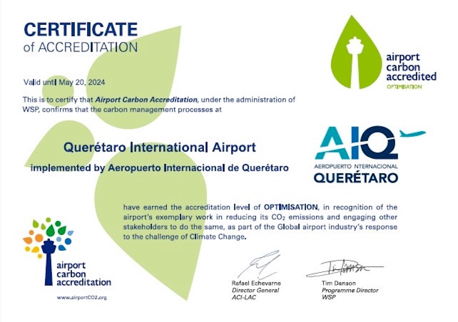 El Aeropuerto Internacional de Querétaro (AIQ) alcanzó el nivel 3 de Airport Carbon Accreditation (ACA), un programa que promueve la gestión y reducción efectiva de emisiones de gases de efecto invernadero en la industria aeroportuaria, así lo informó el titular de la Secretaría de Desarrollo Sustentable (Sedesu), Marco Antonio Del Prete Tercero.