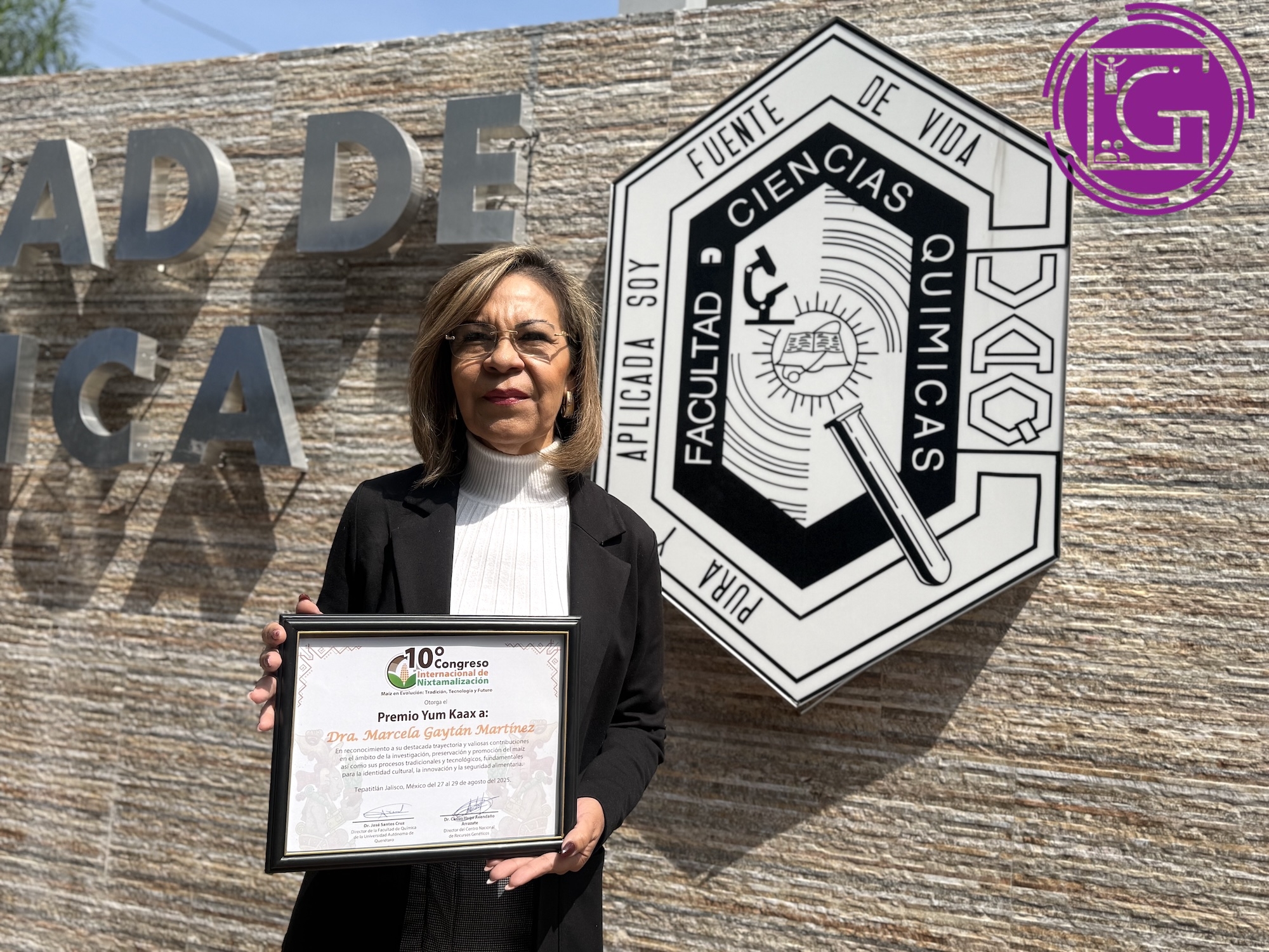 La profesora investigadora de la Facultad de Química (FQ) de la Universidad Autónoma de Querétaro (UAQ), Marcela Gaytán Martínez, fue distinguida con el premio “Yum Kaax”, en reconocimiento a su destacada trayectoria y sus valiosas contribuciones en el ámbito de la investigación, preservación y promoción del maíz.