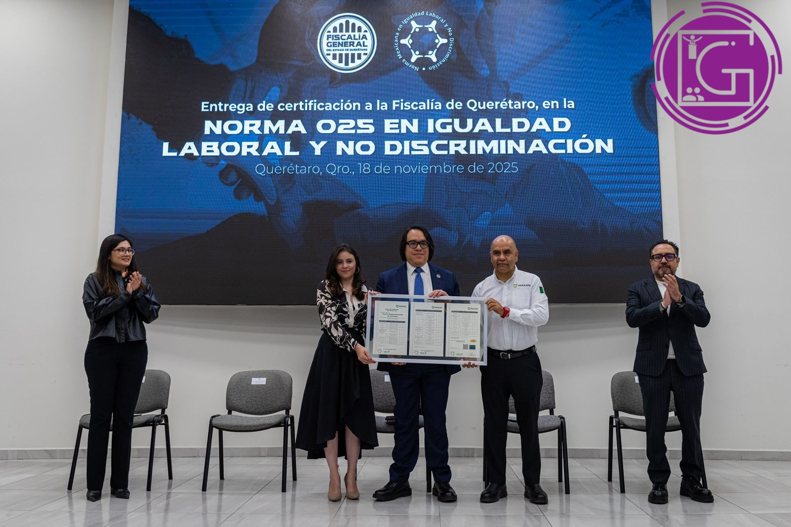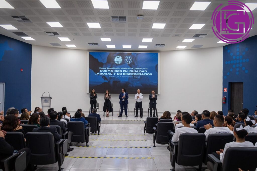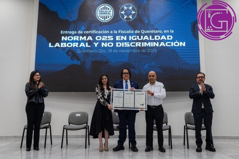 La Fiscalía General del Estado de Querétaro recibió la certificación en la Norma Mexicana NMX-R-025 en Igualdad Laboral y No Discriminación, que acredita la implementación de prácticas de igualdad, accesibilidad y prevención de la violencia laboral en las 28 unidades que integran la Institución.