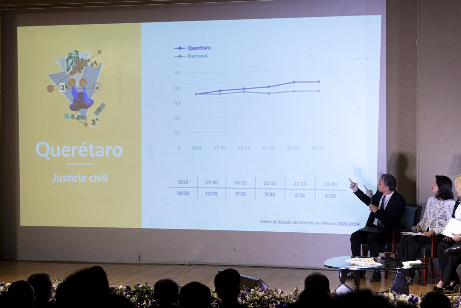 Como parte de esta presentación, el jefe Global de Incidencia de World Justice Project, Alejandro González, encabezó el conversatorio Retos y Propuestas para el Futuro, donde destacó que además de los resultados constantes en justicia penal, en los últimos años se ha observado una tendencia a la alza en mejoras al sistema de justicia civil de Querétaro.