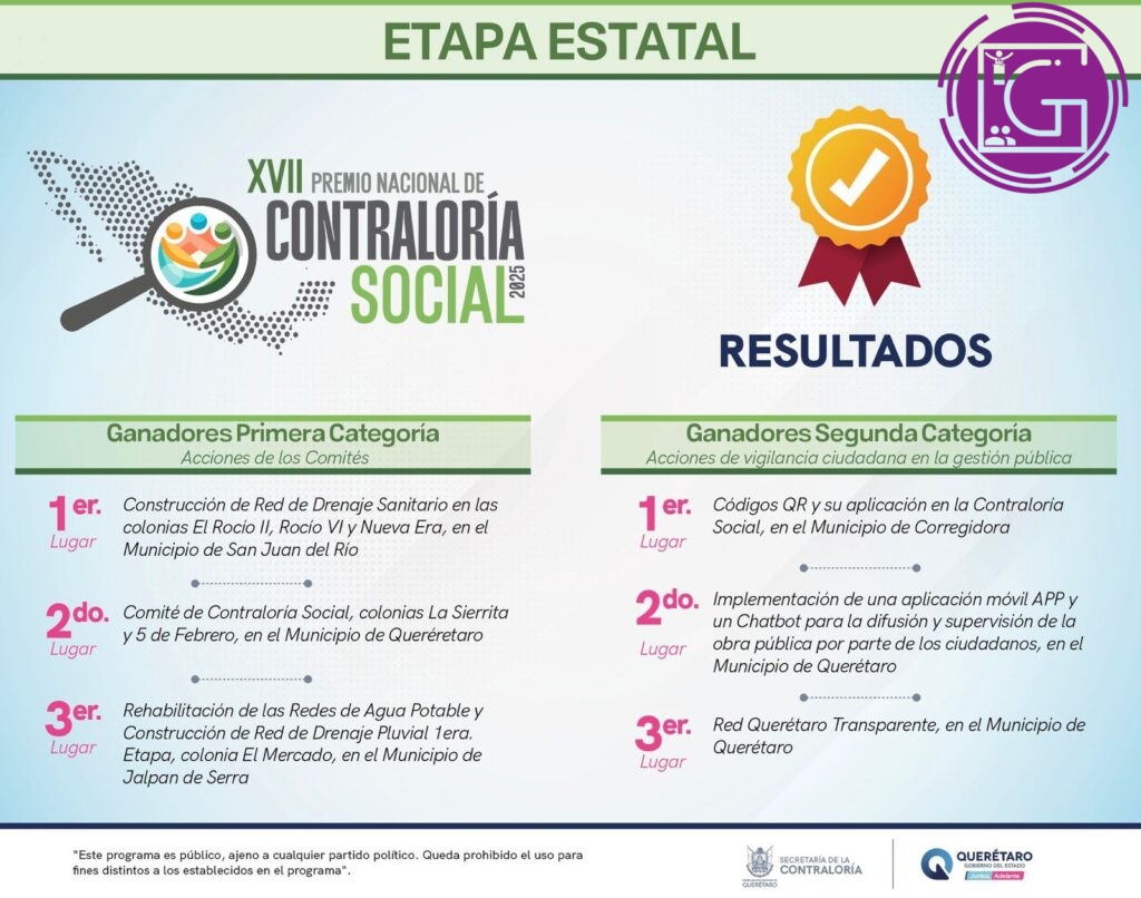 “Con este triunfo, San Juan del Río se consolida como un referente en materia de contraloría social y participación comunitaria. El Comité Los Rocíos representará al estado de Querétaro en la etapa nacional del XVII Premio Nacional de Contraloría Social 2025”, remató Toño Pérez.