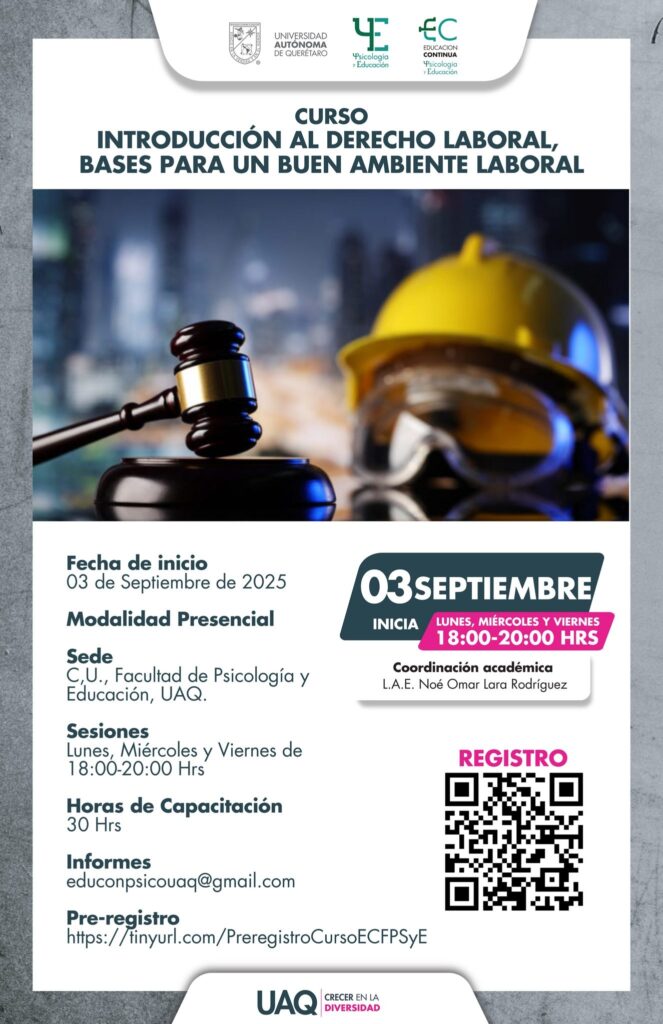 La Facultad de Psicología y Educación (FΨE) de la Universidad Autónoma de Querétaro (UAQ), a través del área de Educación Continua, lanzó la convocatoria para el curso “Introducción al derecho laboral, bases para un buen ambiente laboral”, que comenzará el próximo 3 de septiembre en modalidad presencial, en las instalaciones de Centro Universitario, coordinado por Noé Omar Lara Rodríguez.