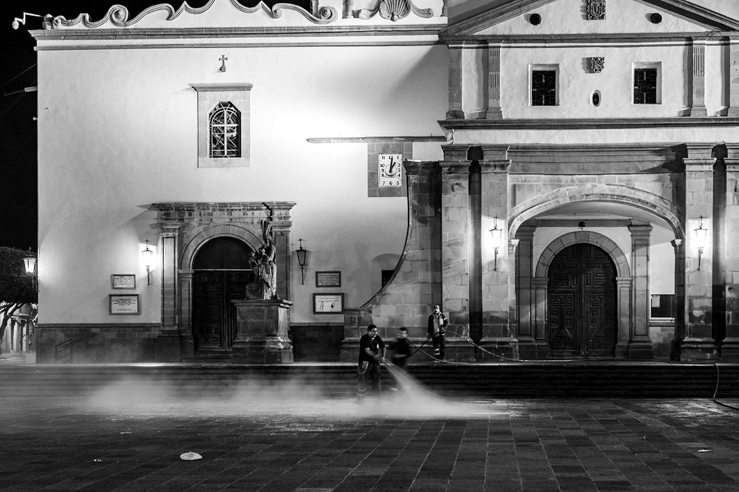 Mientras que Gordillo Muñoz, bajo el pseudónimo “JukilitaKalavera”, interviene con la fotografía “Lavando los pecados”. En ella captó al personal de limpieza durante una jornada nocturna, mientras rociaban agua en la explanada del Templo de la Santa Cruz. El universitario juega con ambos elementos para reflejar cómo el crecimiento de la capital obliga la presencia de estas brigadas, a la vez que hace un guiño a la “absolución de los pecados”.
