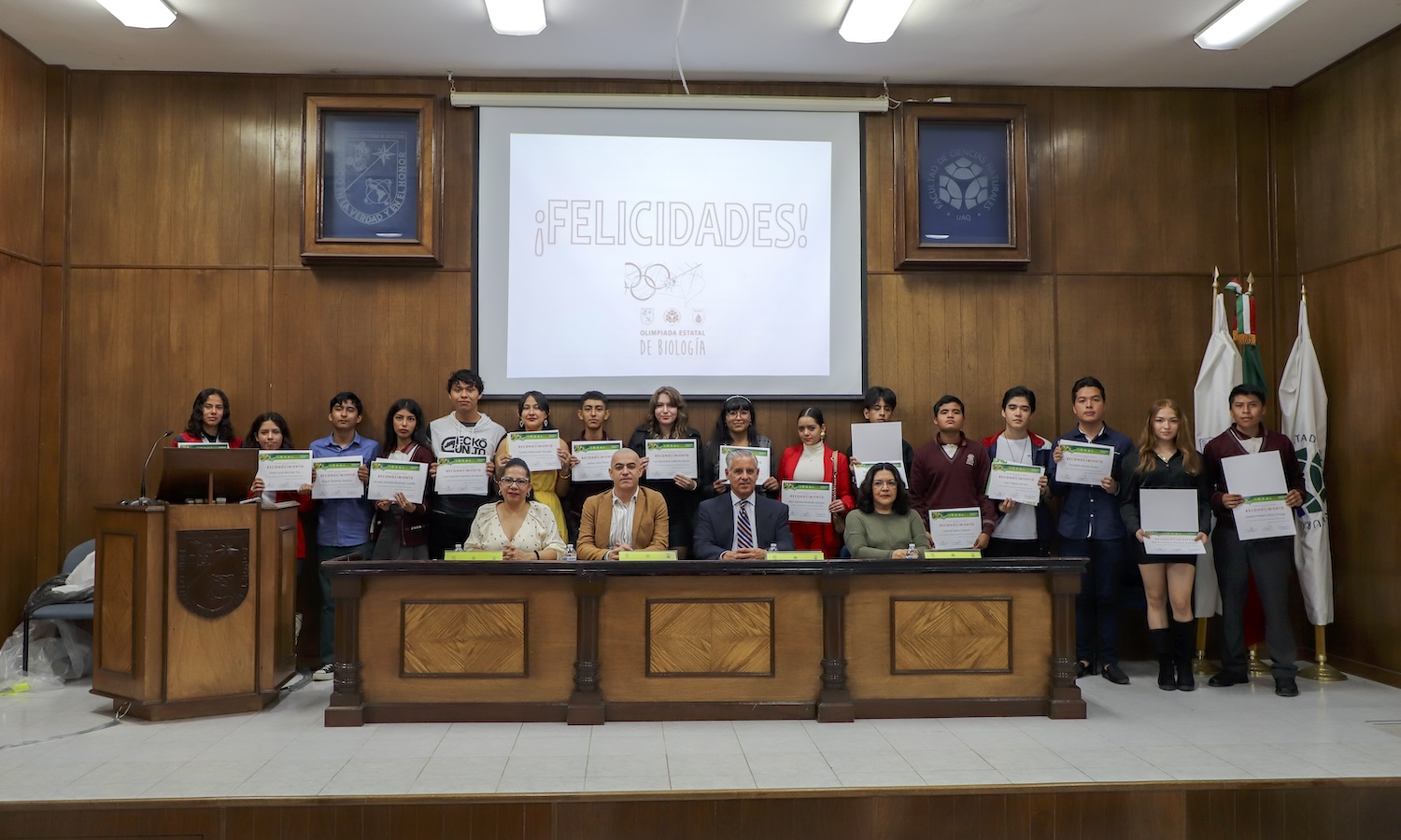 Autoridades de la Facultad de Ciencias Naturales (FCN) de la Universidad Autónoma de Querétaro (UAQ) premiaron a los 14 jóvenes ganadores de la 33° Olimpiada Estatal de Biología, provenientes de distintas instituciones educativas de seis municipios del estado y cuyos primeros lugares representarán a la entidad en la justa nacional del 12 al 16 de noviembre en Culiacán, Sinaloa.