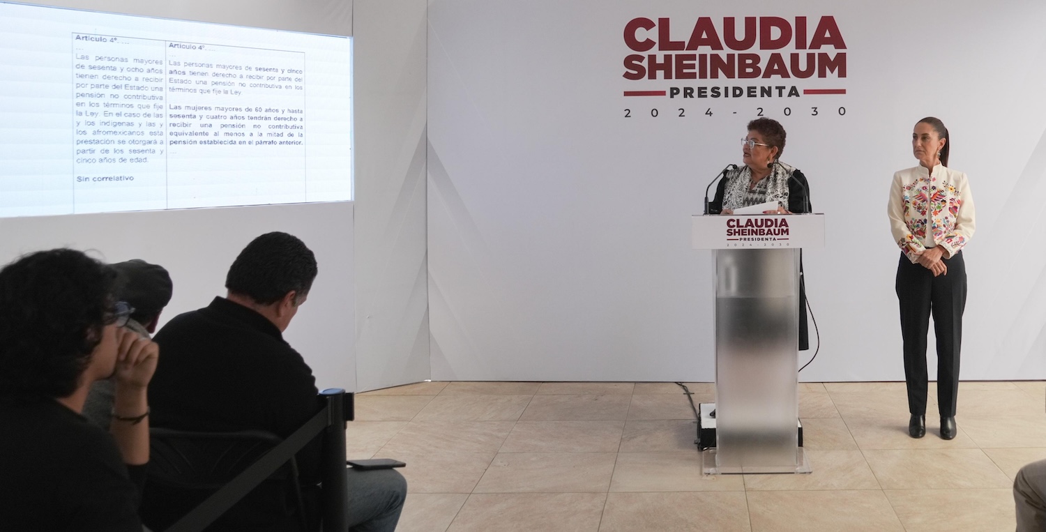 Finalmente, para el apoyo a mujeres de 60 a 64 la Constitución establecerá que: “Las mujeres mayores de 60 años y hasta sesenta y cuatro años tendrán derecho a recibir una pensión no contributiva, equivalente al menos a la mitad de la pensión establecida en el párrafo anterior’’. Añadió que este día la virtual presidenta electa firmará el oficio para ser enviado a la secretaria de Gobernación.