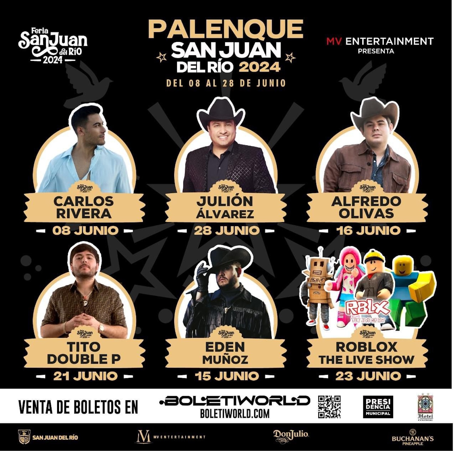 Los artistas para el Palenque de este año son: Carlos Rivera, quien se presentará el 8 de junio; Edén Muñoz, estará el día 15 de junio; Alfredo Olivas, el domingo 16 de junio; el artista Tito Double P, participará el 21 de junio; el show infantil Roblox, se presentará el 23 de junio y el 28 de junio, el cantante Julión Álvarez.