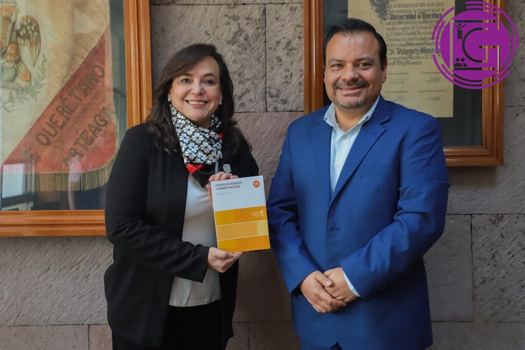 Con la finalidad de contribuir en la formación universitaria y socializar el conocimiento jurídico, mediante una explicación accesible, el próximo 13 de abril se presentará el libro “Estado de derecho y debido proceso”, del docente de la Facultad de Derecho (FDe) de la Universidad Autónoma de Querétaro (UAQ), Jesús García Hernández, quien aprovechó para obsequiar a la rectora, Silvia Amaya Llano, un ejemplar.