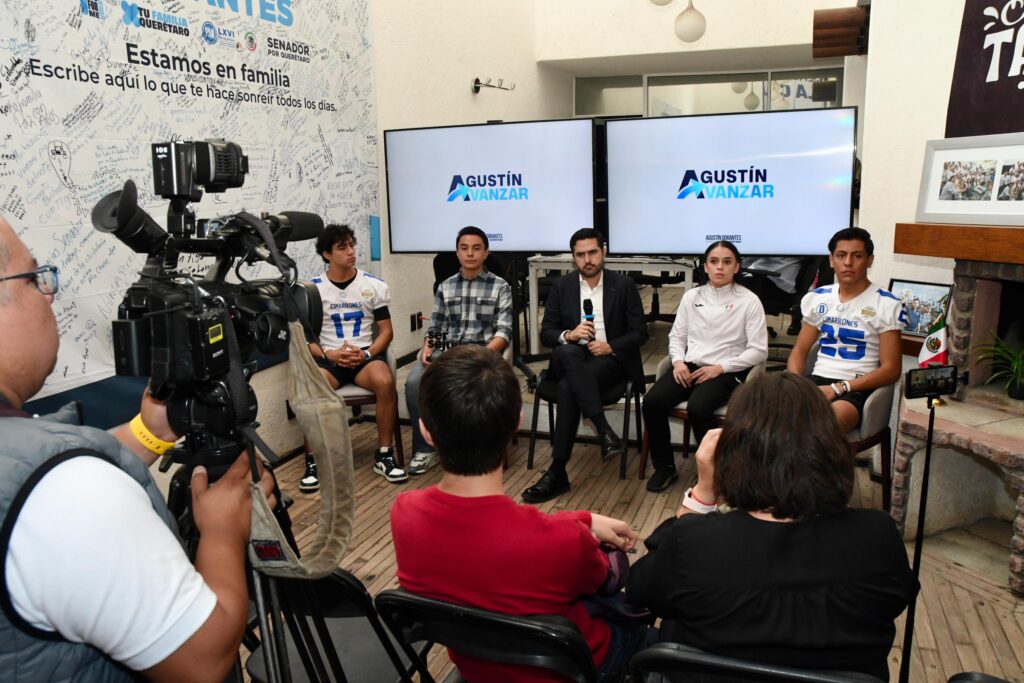 El senador estuvo acompañado en esta rueda de prensa por Leonardo Alarcón Montes y Axel Cruz Cano, del equipo de futbol amerciano Cimarrones y que fueron seleccionados nacionales del Friendship Bowl; Santiago Aldair Ángeles Reyes, Premio Estatal de la Juventud en la categoría de Labor Social.