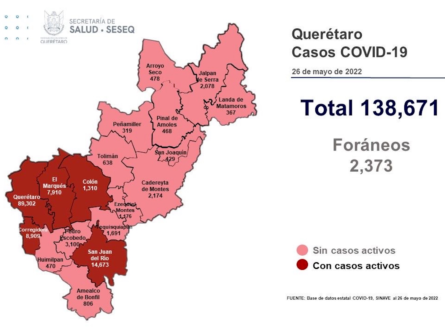 La Secretaría de Salud de Querétaro reportó este jueves cero defunciones por Covid-19, aunque se sumaron 32 casos de la enfermedad; se trata de 20 mujeres y 12 hombres. El registro acumulado es de 138 mil 671 casos; 52% son mujeres y 48% son hombres.