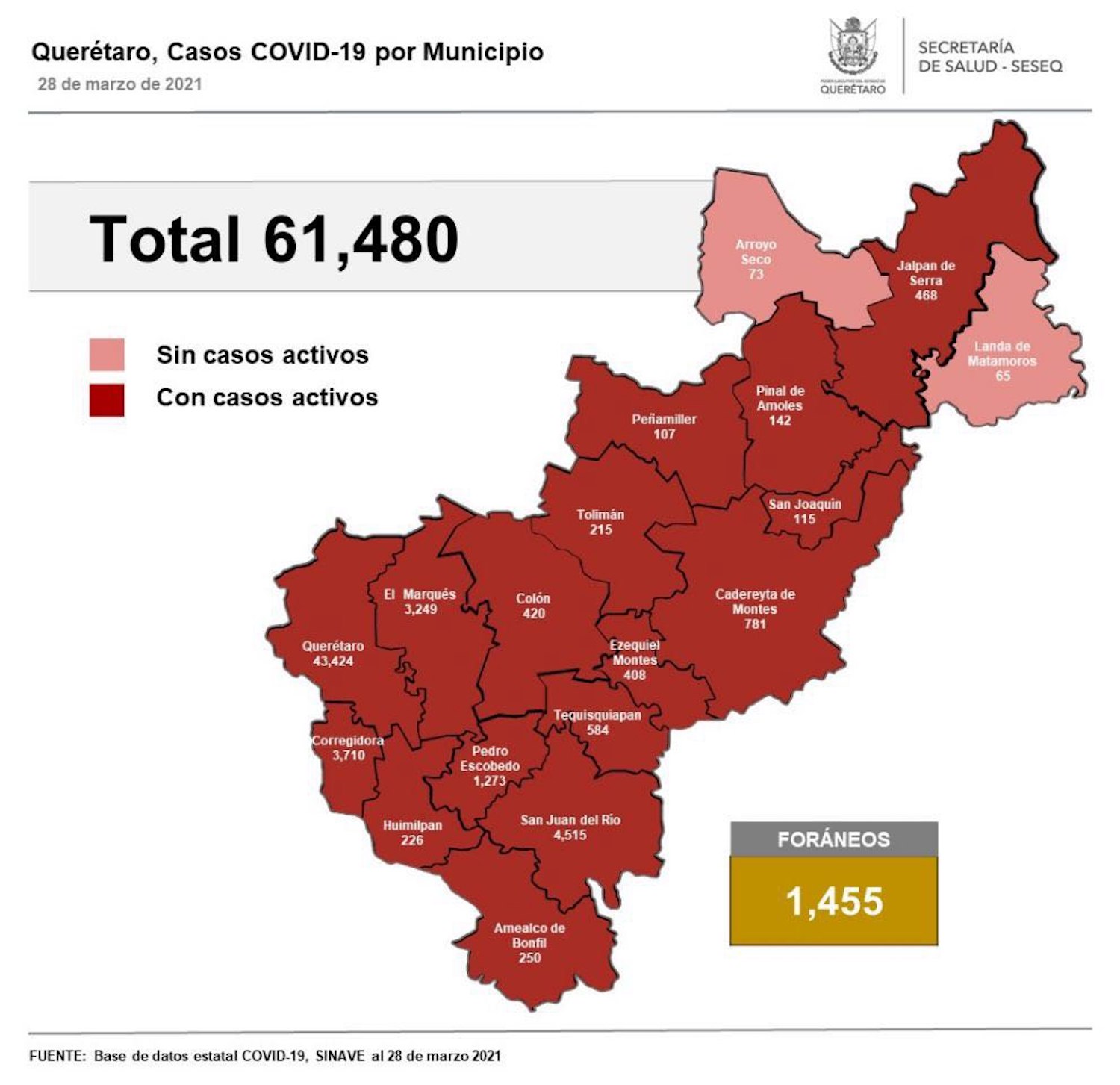 Se tiene un registro acumulado de 61 mil 480 casos de Covid-19; 51% son mujeres y 49% son hombres.