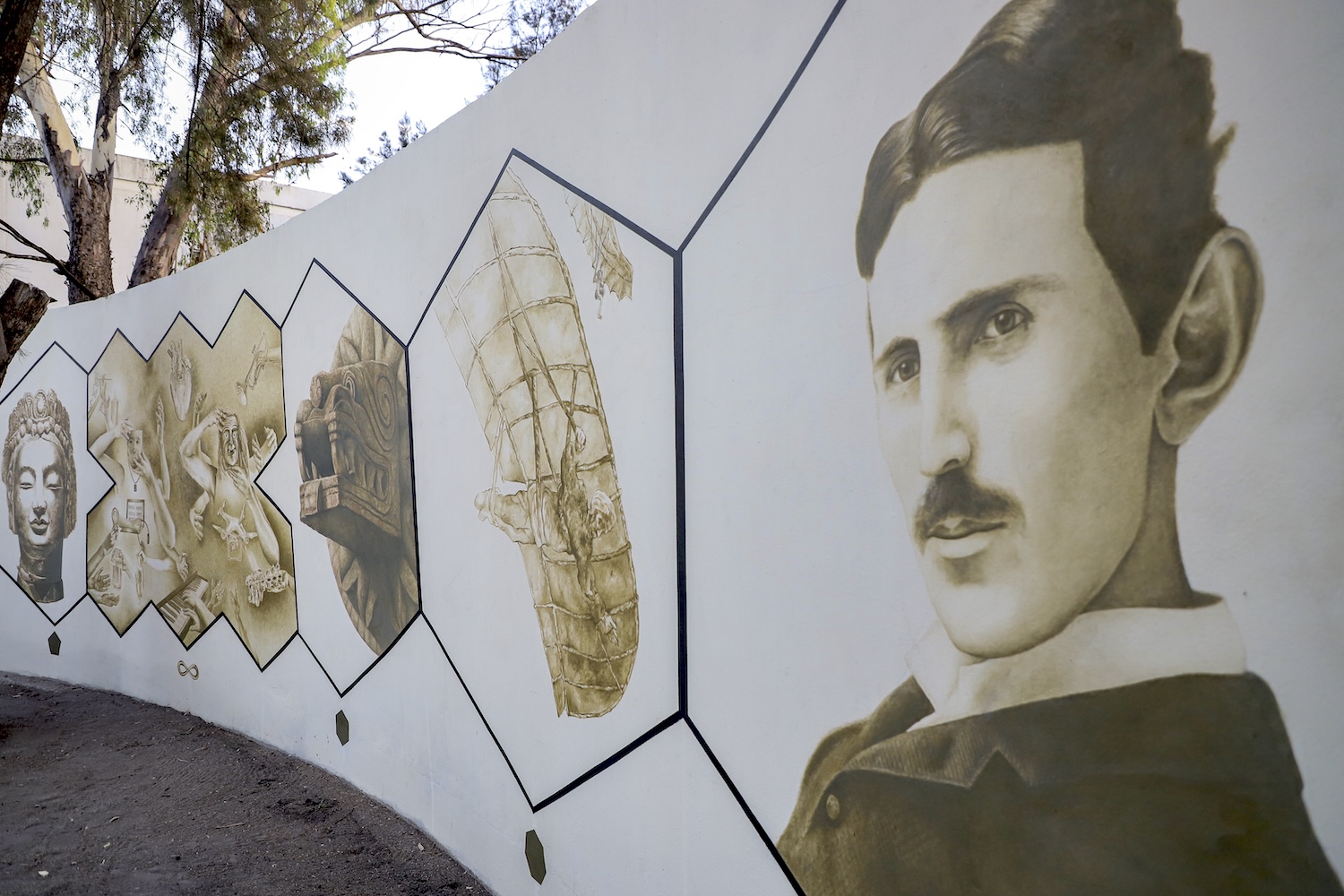 Visualmente, el mural permite explorar las culturas antiguas, la ciencia, el arte, la filosofía y la tecnología. Los trazos se despliegan desde el centro hasta los costados provocando la ilusión de ser un origami japonés. Se compone de diez paneles que simbolizan las manos de todos los creadores de la facultad.