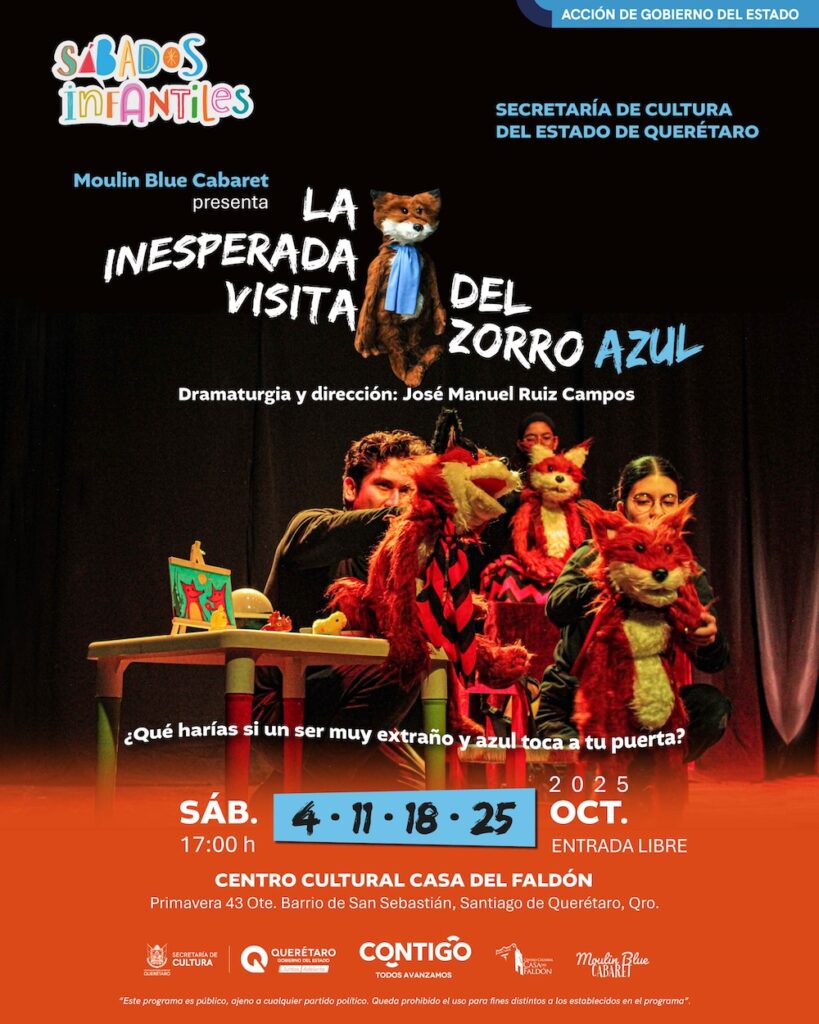 Con entrada libre, “La Inesperada Visita del Zorro Azul” se presentará todos los sábados de octubre, a las 17:00 horas, en el Centro Cultural Casa del Faldón que se ubica en la calle Primavera, número 43, Barrio de San Sebastián, en la ciudad de Querétaro.