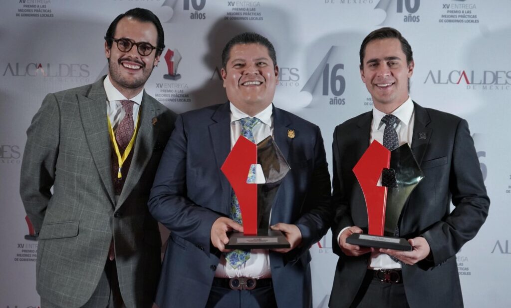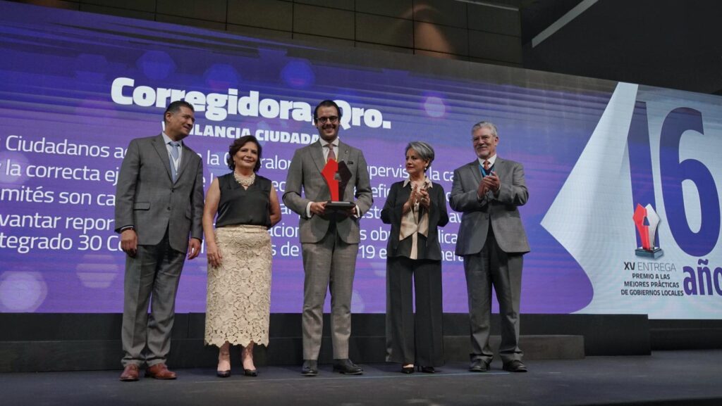 El secretario Técnico del municipio de Corregidora, Hugo Lora, y el secretario de Control y Evaluación, Carlos Olguín, recibieron el premio Alcaldes de México en la categoría Vigilancia Ciudadana, por la creación de comités donde la propia población supervisa la calidad, el avance y la correcta ejecución de las obras públicas.