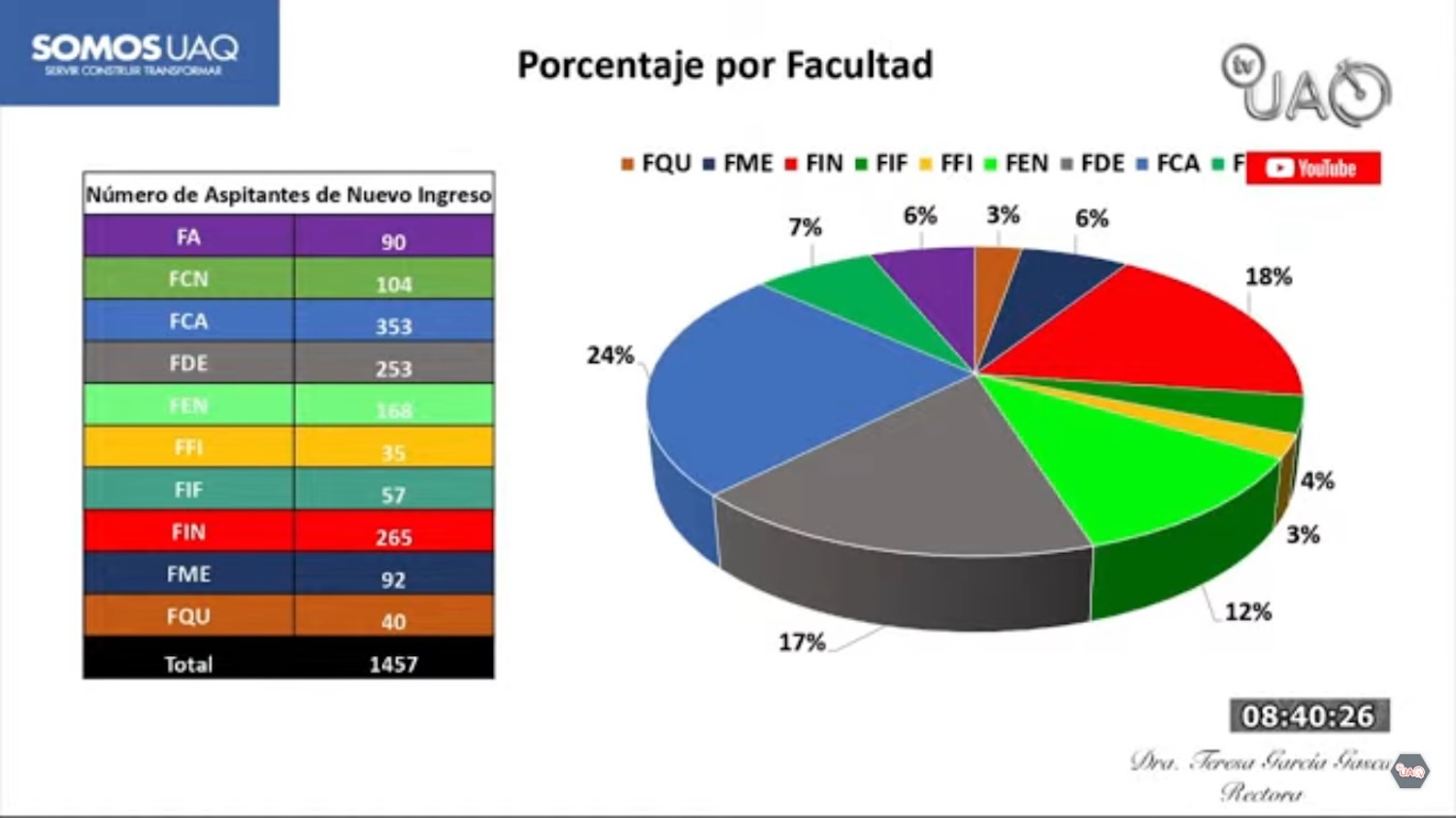 En el arranque de este 2024, la Universidad Autónoma de Querétaro (UAQ) abre sus puertas a mil 457 nuevos estudiantes, quienes ingresan a distintas licenciaturas de 10 facultades: Artes (FA), Ciencias Naturales (FCN), Contaduría y Administración (FCA), Derecho (FD), Enfermería (FEn), Filosofía (FFi), Informática (FIf), Ingeniería (FI), Medicina (FM) y Química (FQ).