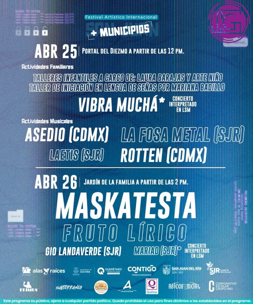 Al día siguiente, es decir, el domingo 26 de abril, el Jardín de la Familia recibirá, desde las 14 horas, a agrupaciones como Maskatesta, Fruto Lírico, Gio Landaverde y a Mariad, esta última banda contará con intérprete de LSM.