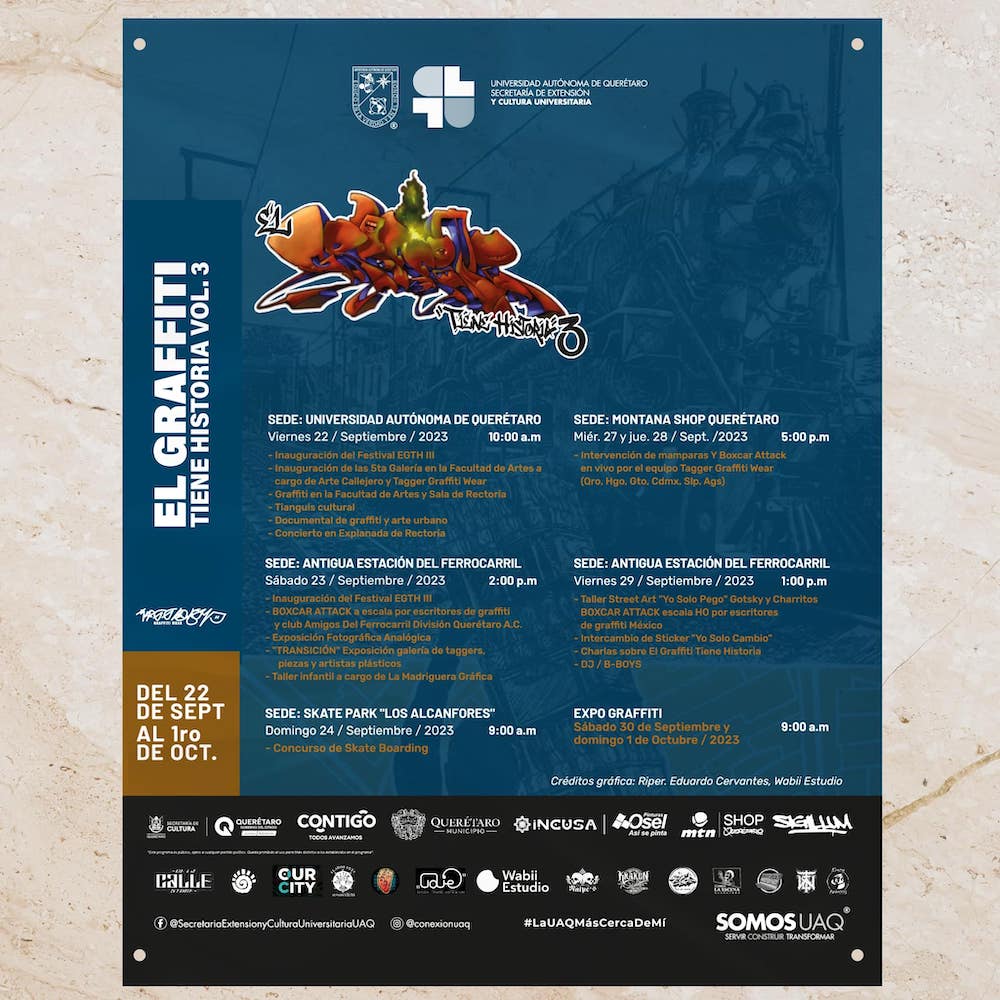 Posteriormente, 23 y 29 de septiembre el punto de encuentro será la Antigua Estación del Ferrocarril; el Skate Park de “Los Alcanfores” le recibirá el 24 de septiembre; y Montana Shop Querétaro le albergará los días 27 y 28 de septiembre. Las actividades concluirán el 30 de septiembre y 1 de octubre con una expo graffiti.