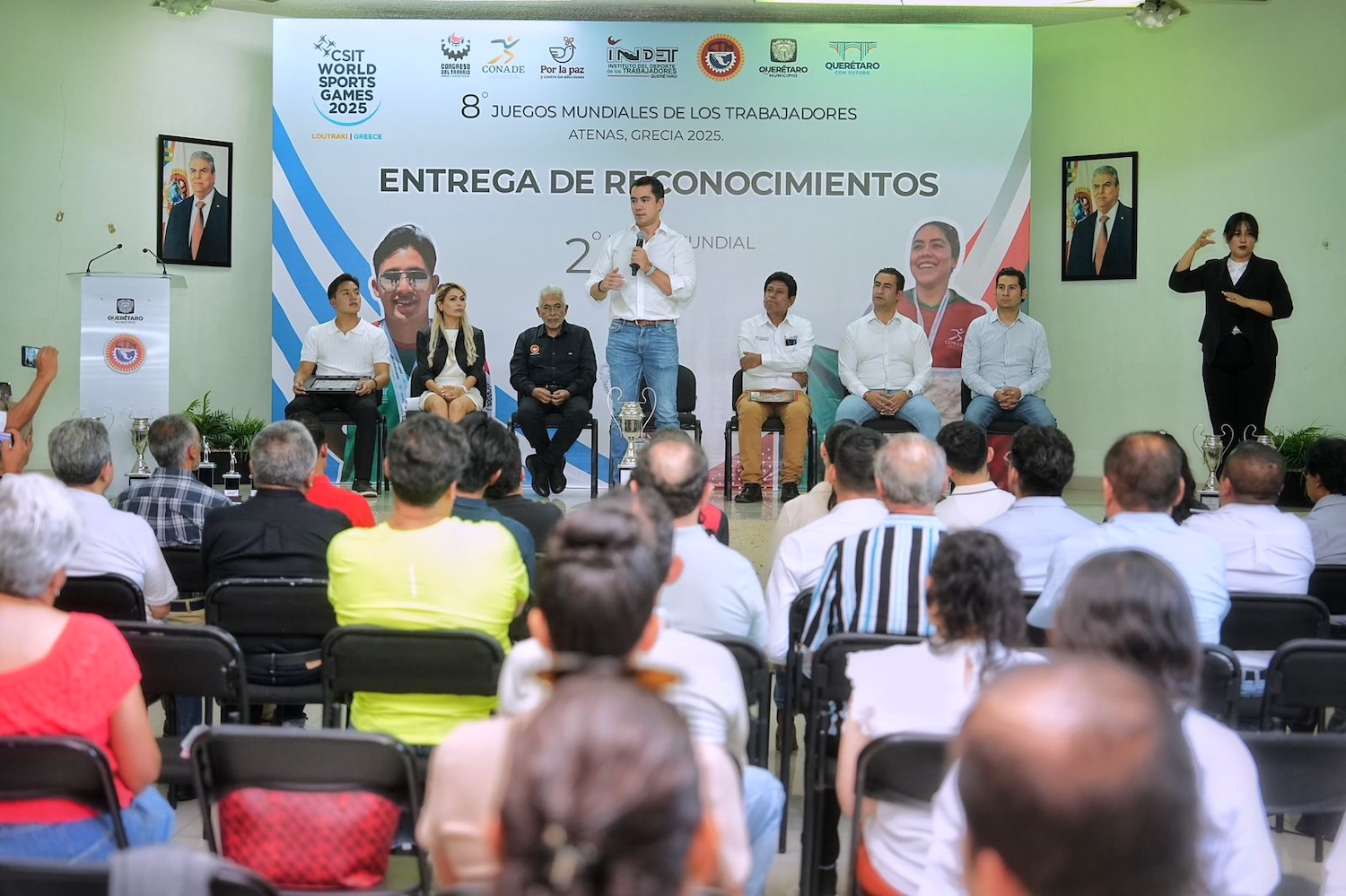 El presidente municipal de Querétaro, Felifer Macías, entregó reconocimientos a los 25 atletas queretanos afiliados a la CTM que representaron a México en la octava edición de los Juegos Mundiales de los Trabajadores, celebrada en Atenas, Grecia, donde lograron un destacado segundo lugar a nivel internacional al obtener un total de 76 medallas en disciplinas como ajedrez, atletismo, natación y voleibol de playa femenil.
