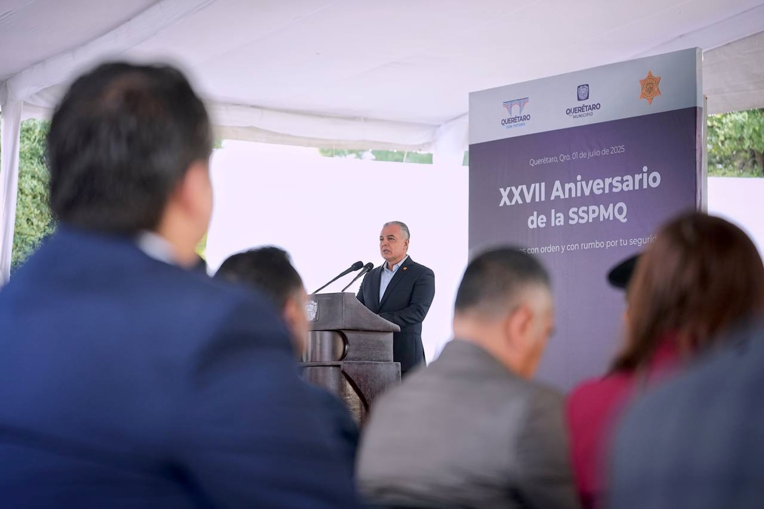 El presidente municipal de Querétaro, Felifer Macías, encabezó la ceremonia por el XXVII Aniversario de la Secretaría de Seguridad Pública Municipal, a la que describió como una corporación referente a nivel nacional, pilar de la comunidad, una institución fuerte, en constante evolución, con crecimiento sostenido, tecnología de vanguardia y personal certificado, capacitado y humano al servicio de las familias queretanas.
