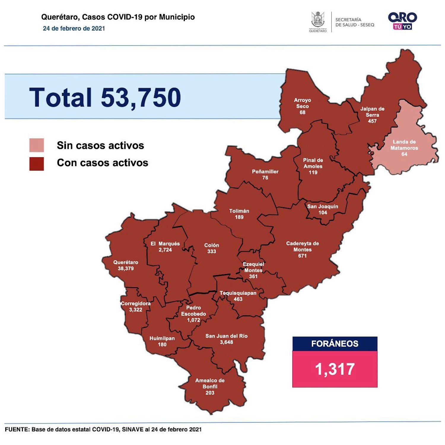 En Querétaro, cinco hombres –de 42, 46, 54, 56 y 70 años– y cuatro mujeres –de 46, 48, 53 y 55–, sin comorbilidad, así como 13 hombres –de 45, 47, 48, 49, 50, 56, 65, dos de 66, 68, dos de 71 y 85–, y 13 mujeres –de 50, 51, tres de 52, 56, 57, 62, 64, 66, 70, 79 y 82 años–, con diversas comorbilidades, que se encontraban hospitalizados, fallecieron a causa de Covid-19.