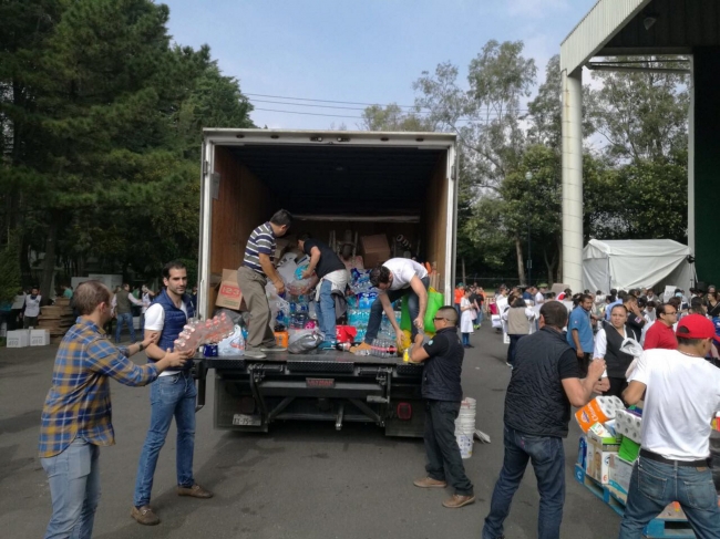 La ayuda que miles de mexicanos mandan al centro de acopio de Campo Marte para los afectados por el sismo del 19 de septiembre, se sube directamente a los camiones para su distribución inmediata donde se requiere.