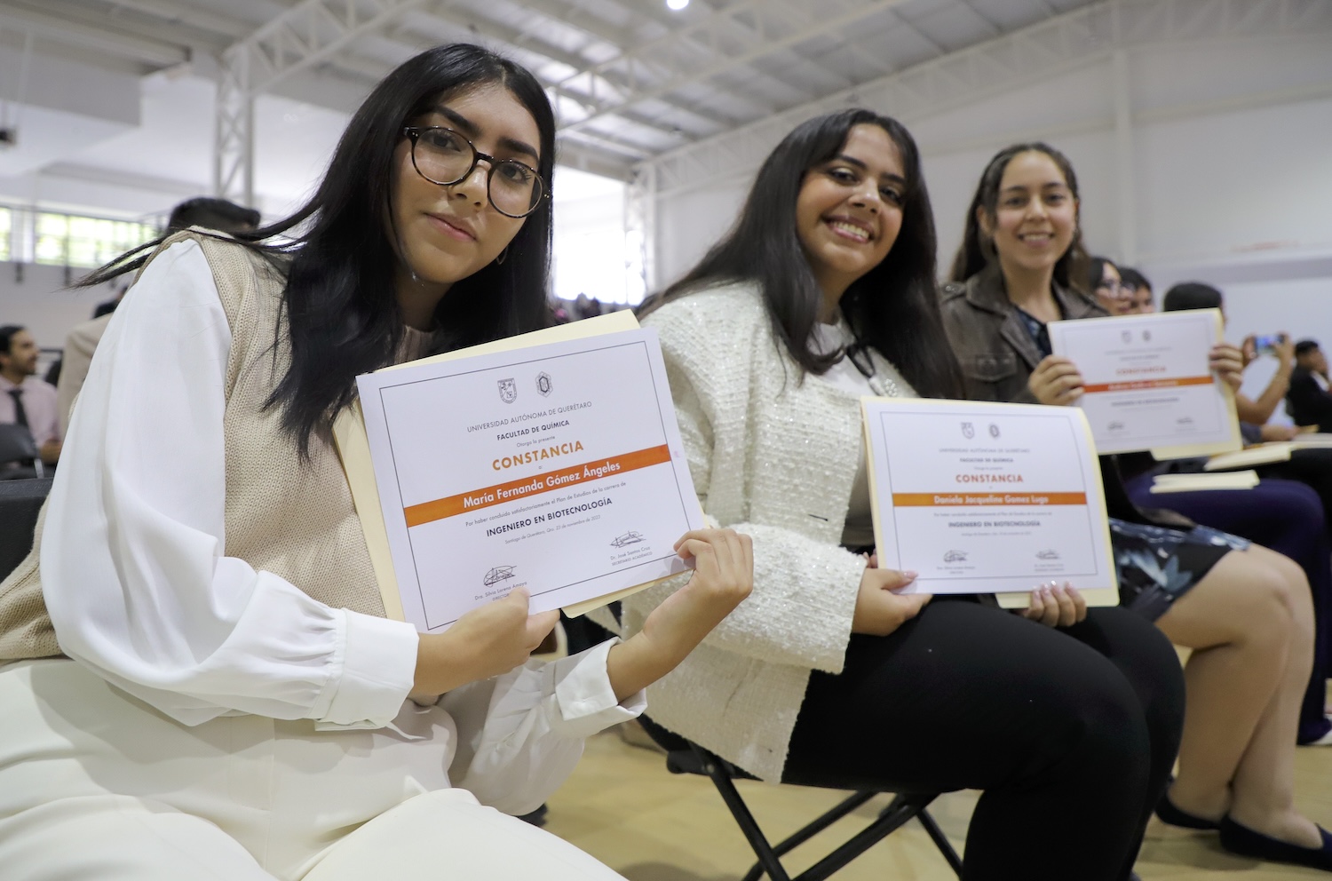 Autoridades de la Universidad Autónoma de Querétaro (UAQ) y de la Facultad de Química (FQ) celebraron el egreso de la generación 2023-2 mediante una ceremonia realizada en las instalaciones del Poliforum de esta Unidad Académica y a la que acudieron los estudiantes de los programas: Ingeniero Agroquímico, Ingeniero Químico Ambiental, Ingeniero Químico en Alimentos, Ingeniero Químico en Materiales, Ingeniero Químico Farmacéutico Biólogo e Ingeniero en Biotecnología.