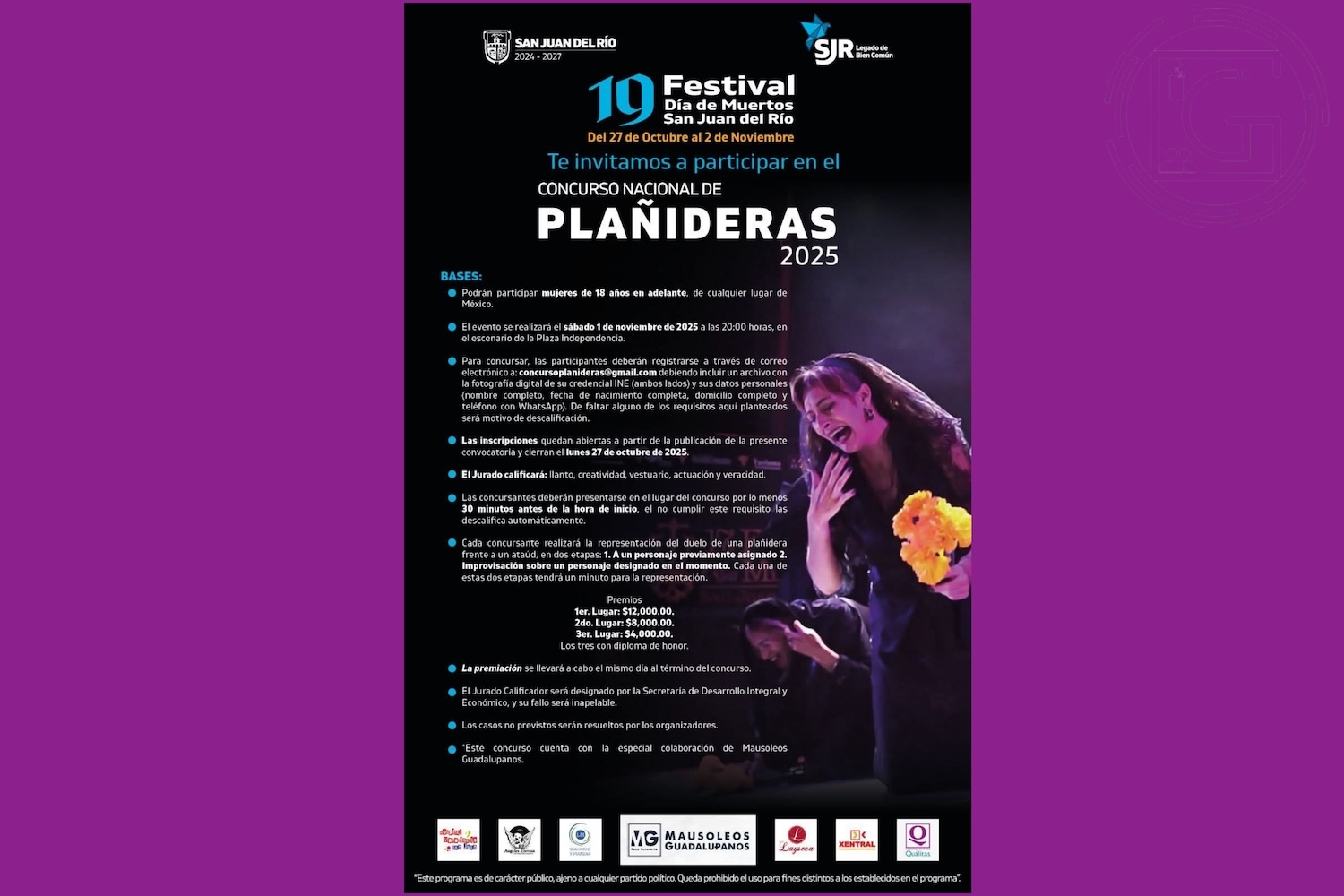 El “Concurso Nacional de Plañideras 2025” forma parte del 19º Festival de Día de Muertos San Juan del Río, mismo que contempla, del mismo modo, la realización de la “Marcha de los Muertos”, a desarrollarse el viernes 31 de octubre a las 19:00 horas en el Puente de la Historia, para concluir en Plaza Independencia. En este evento podrán participar personas de todas las edades con un disfraz relativo al Día de Muertos; durante la marcha, 15 concursantes serán elegidos con un distintivo y participarán en una pasarela. El primer lugar será acreedor a 10 mil pesos, el segundo a 7 mil y el tercero a 5 mil pesos.