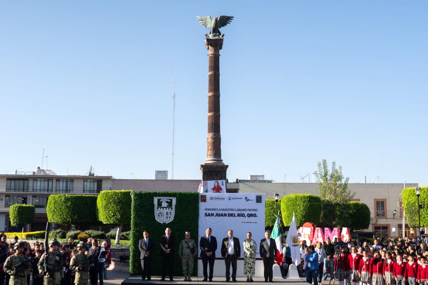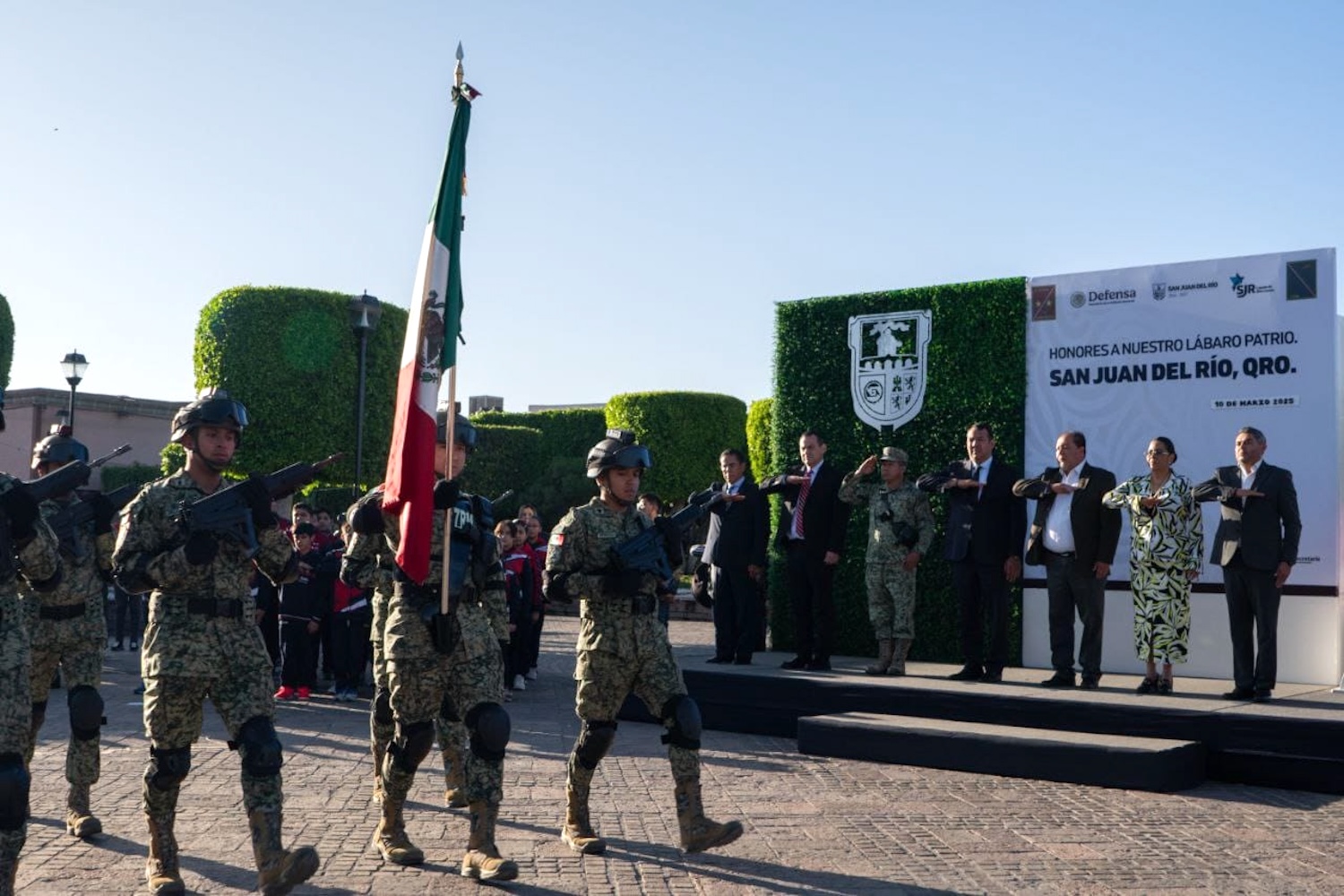 En el municipio de San Juan del Río se construye una mejor sociedad, una mejor ciudad, un mejor gobierno y un Legado de Bien Común a través de los valores cívicos y patrióticos, dijo el presidente municipal sanjuanense, Roberto Cabrera Valencia, en su mensaje con motivo de la ceremonia de honores a la Bandera, realizada en la explanada de la Plaza Independencia.