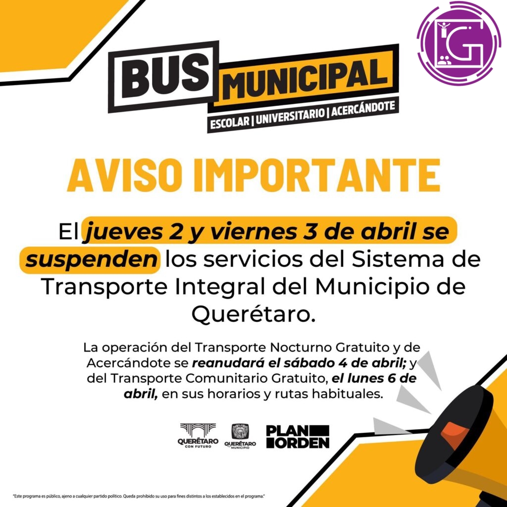El municipio de Querétaro, a través de la Secretaría de Movilidad, informa a la ciudadanía que los días jueves 2 y viernes 3 de abril de 2026 se suspenderán los servicios del Sistema de Transporte Integral del municipio de Querétaro con motivo de las celebraciones de Semana Santa.