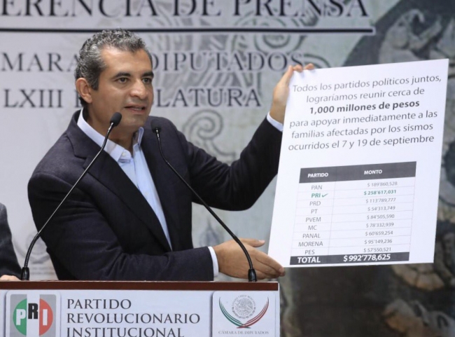 En conferencia de prensa conjunta, el presidente nacional del PRI, Enrique Ochoa Reza, y sus coordinadores parlamentarios, Emilio Gamboa, en el Senado, y César Camacho, en la Cámara de Diputados, convocaron a los demás partidos a renunciar hoy mismo a la totalidad de su financiamiento para el año en curso, con lo que se lograrían casi mil millones de pesos en apoyo a los damnificados.