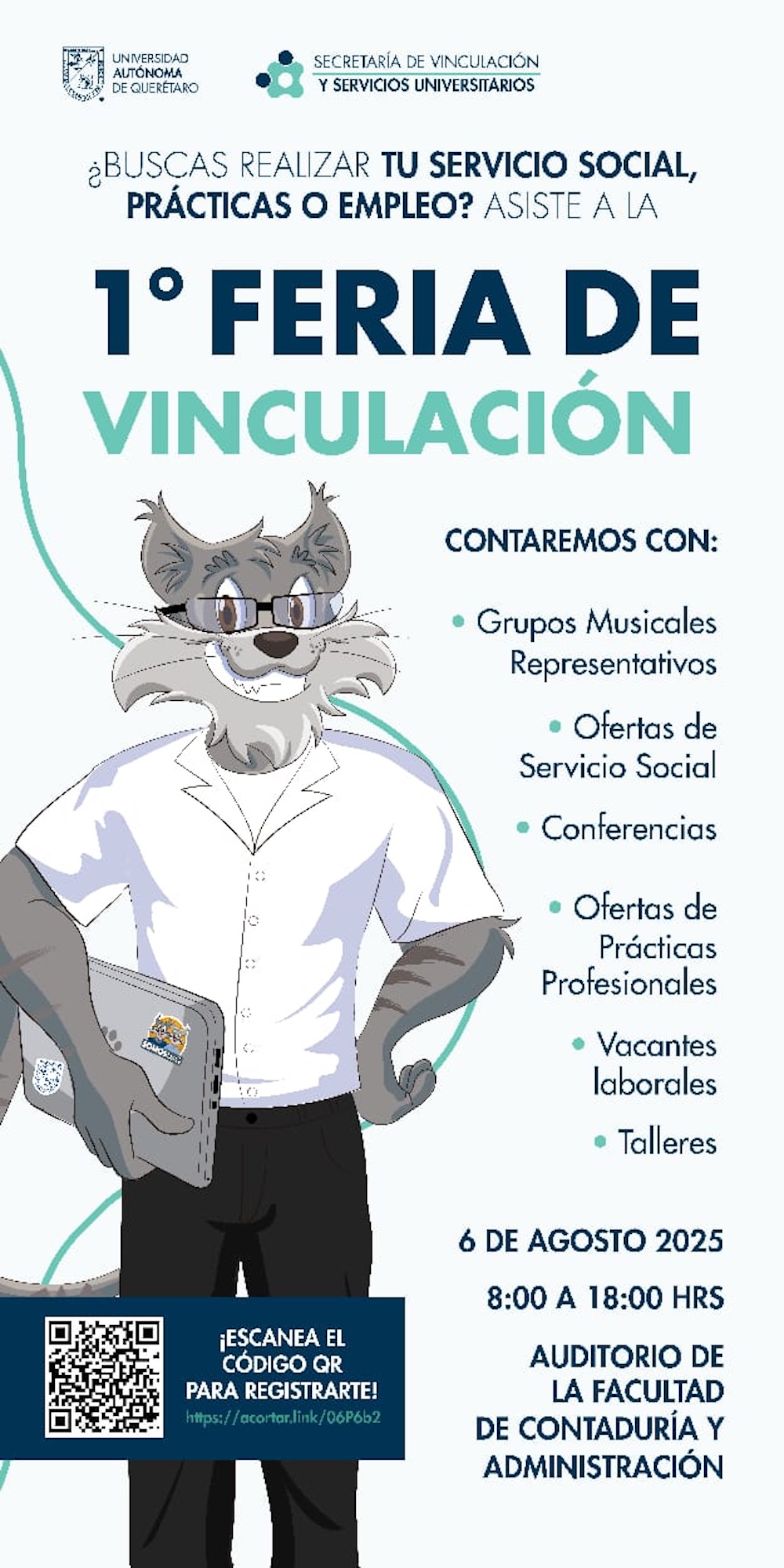 Con el objetivo de ofrecer opciones para llevar a cabo su servicio social y prácticas profesionales, así como un escaparate de ofertas de trabajo, la Secretaría de Vinculación y Servicios Universitarios (SVSU) de la Universidad Autónoma de Querétaro (UAQ), a través de la Dirección de Vinculación organizará la primer Feria de Vinculación el próximo 06 de agosto en el auditorio de la Facultad de Contaduría y Administración.