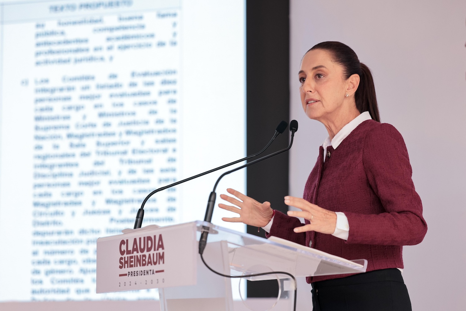 “A diferencia del pasado o de ahora en donde el presidente tiene mano en nombrar a sus ministros (…) La presidenta ya no va a tener mano en nombrar a sus ministros, es un proceso muy transparente de revisión de currículums, de revisión de razones por las cuales alguien quiere ser ministro o magistrado, juez y a partir de ahí de los finalistas, todavía hay un proceso adicional, para evitar que sea un dedazo de los amigos, conocidos de la presidenta’’.