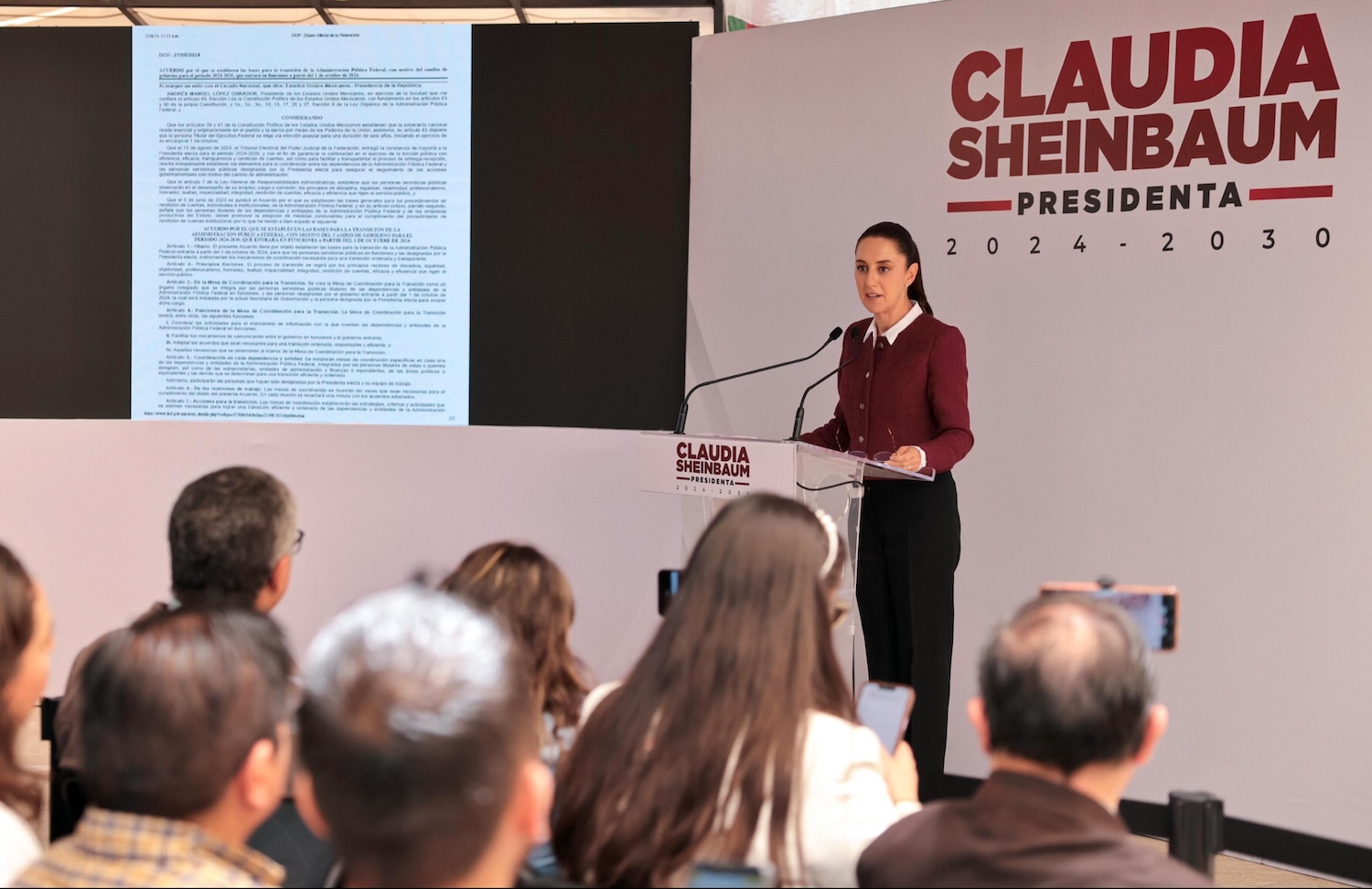 En conferencia de prensa, la presidenta electa también informó que de acuerdo con las bases publicadas en el Diario Oficial de la Federación (DOF) será en los próximos días cuando se instale de manera formal la Mesa de Coordinación para la Transición, entre el gobierno del presidente Andrés Manuel López Obrador y el que ella encabezará, la cual estará a cargo de la actual secretaria de Gobernación, Luisa María Alcalde, y la futura titular de este cargo, Rosa Icela Rodríguez, además de estar conformada por personas servidoras públicas titulares de las dependencias y entidades de la Administración Pública Federal en funciones.